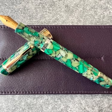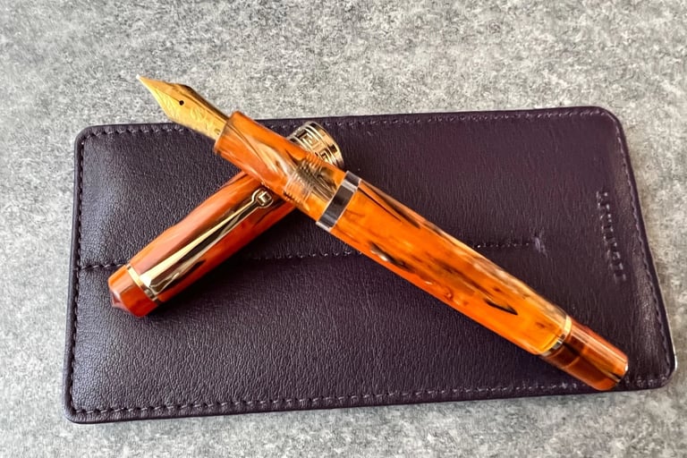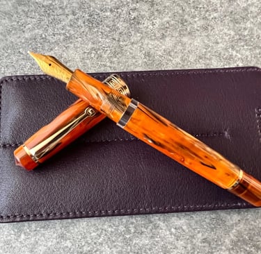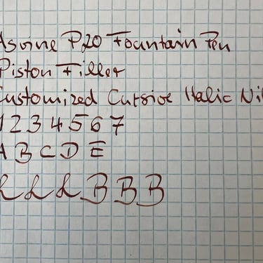 The Asvine P20 is a well‑made fountain pen featuring a piston filling system and a moderate Italic medium nib ground bey Pen & Beyond. Available in Amber, Jade Green and Pacific Blue.